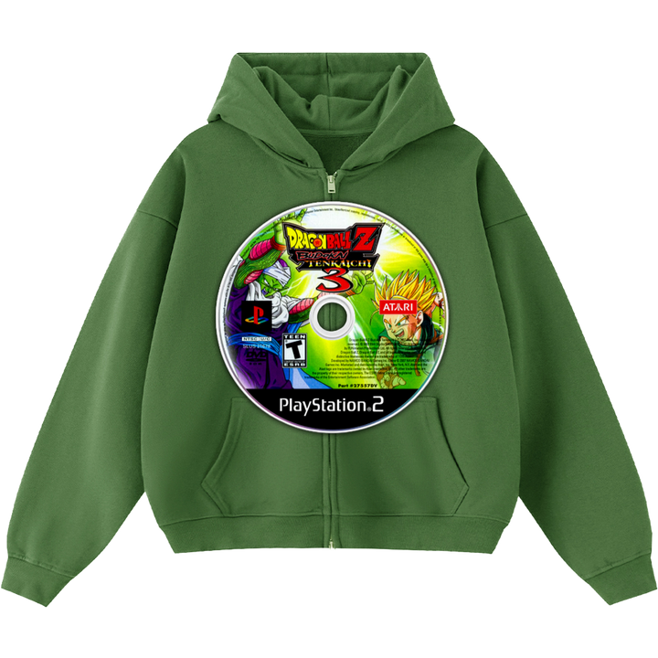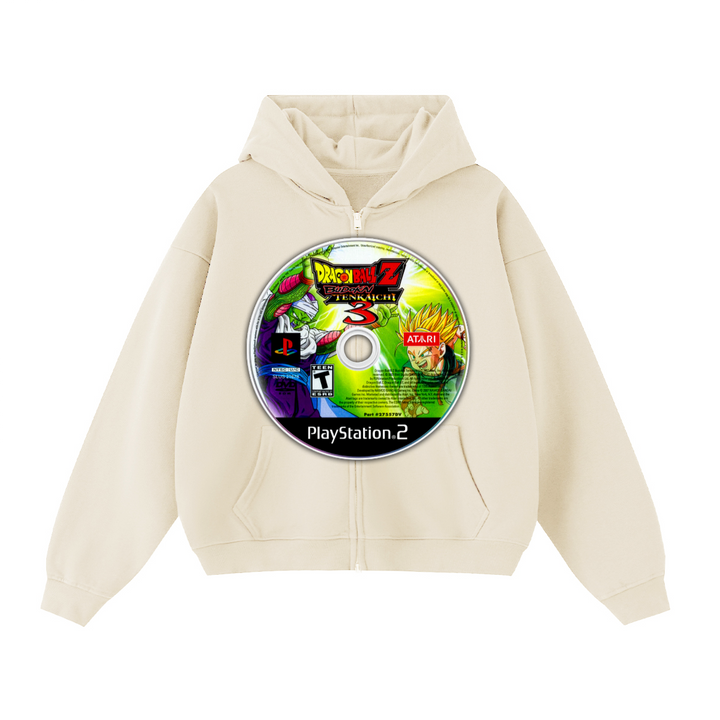 DBZ Dragon Ball Game Disc Cropped Zip-Up Boxy Hoodie | Streetwear Hoodies | Y2K Video Game Hooded Sweatshirt | Unisex Graphic Zip Ups | Oversized