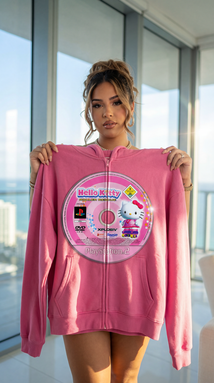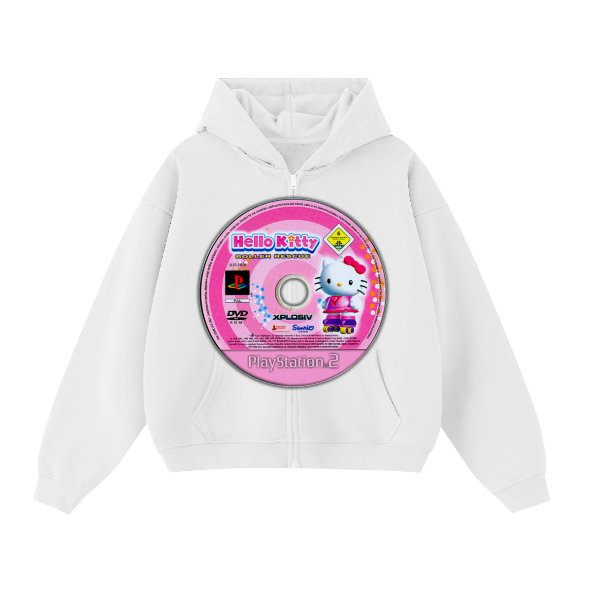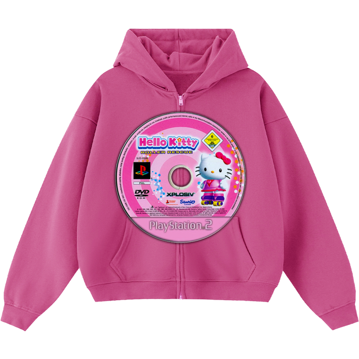 Hello Kitty Game Disc Cropped Zip-Up Boxy Hoodie | Streetwear Hoodies | Y2K Video Game Hooded Sweatshirt | Unisex Graphic Zip Ups | Oversized