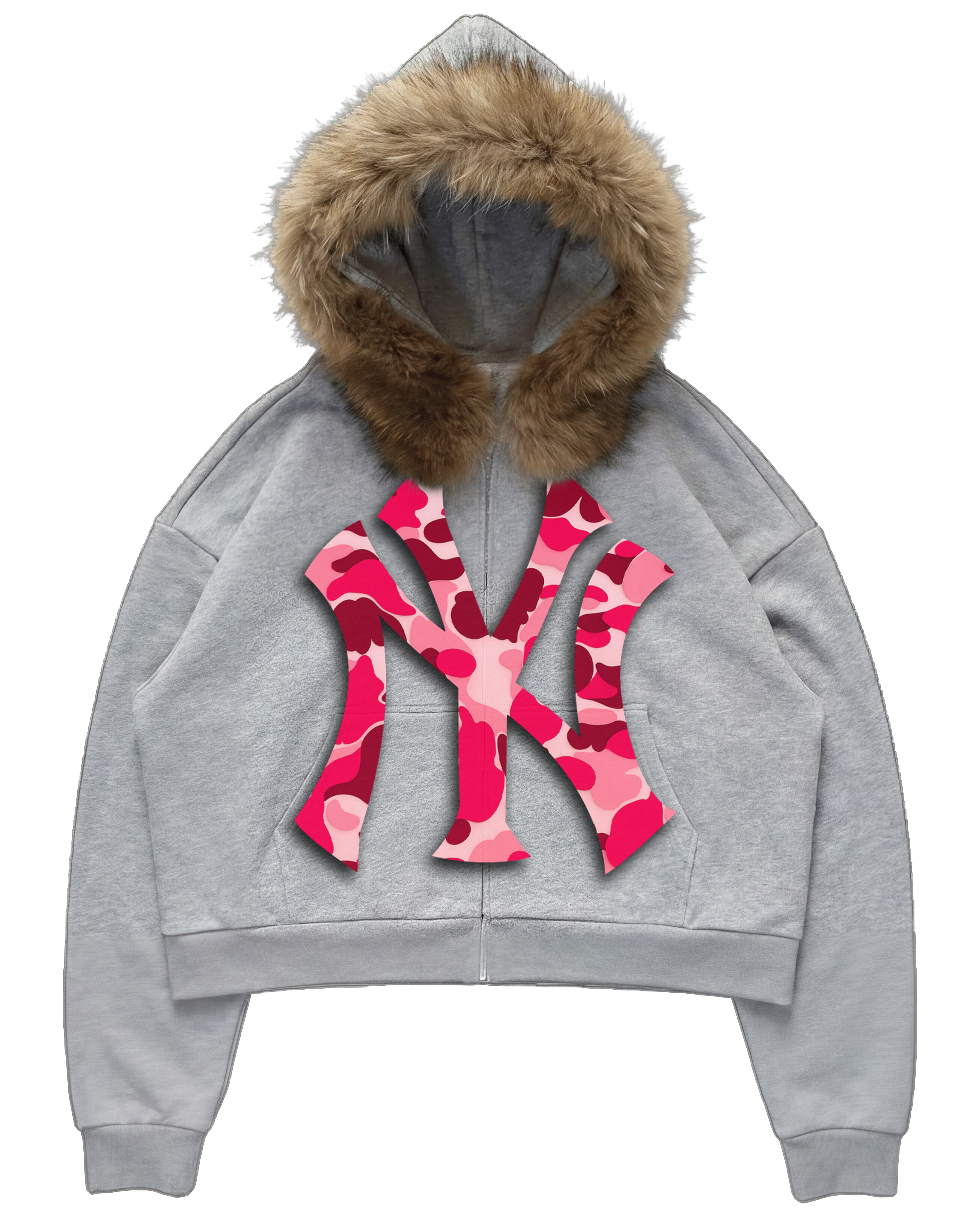NY Pink Camo Uptown Skyline Fur Detachable Zip Up Hoodie Y2K Loose Fit Cropped