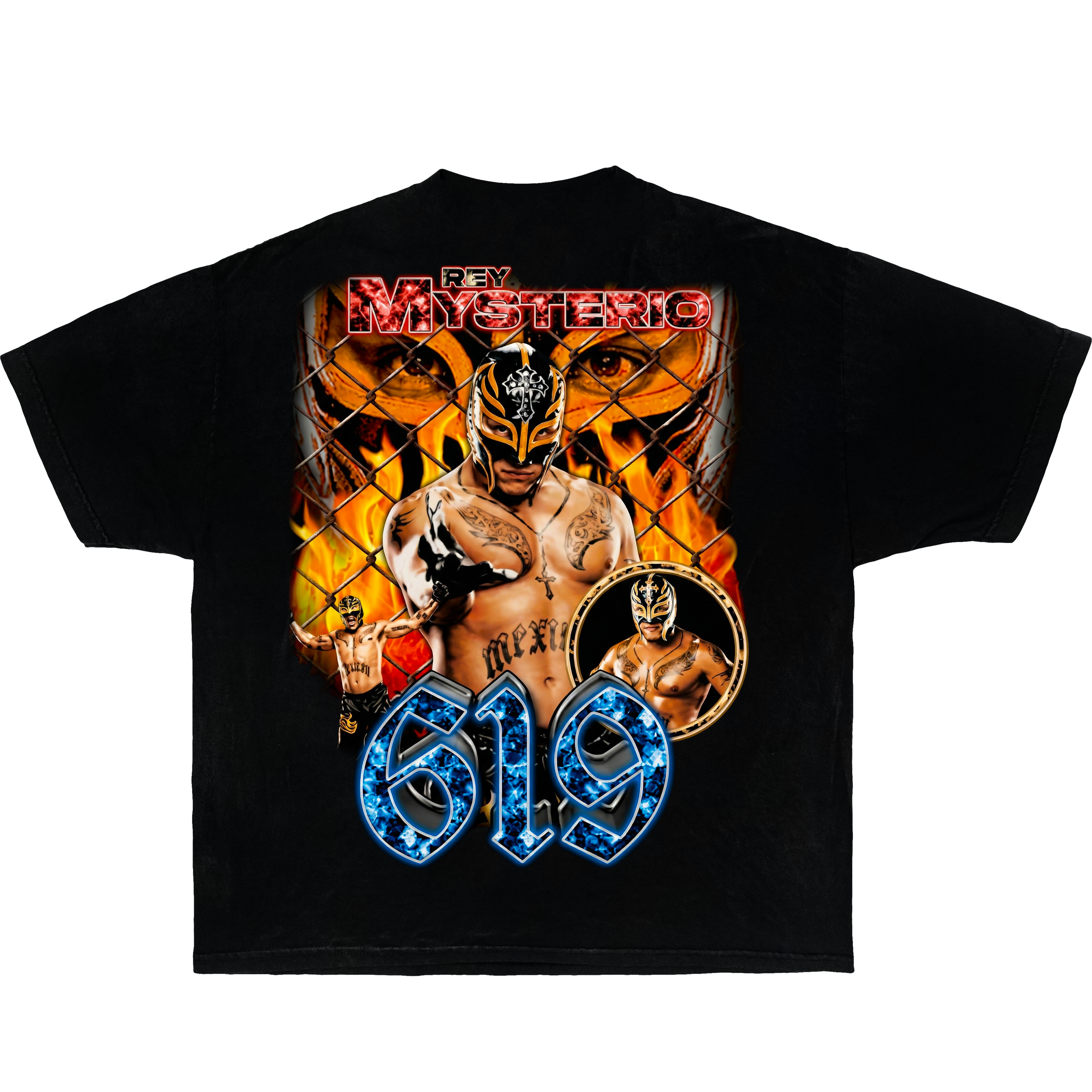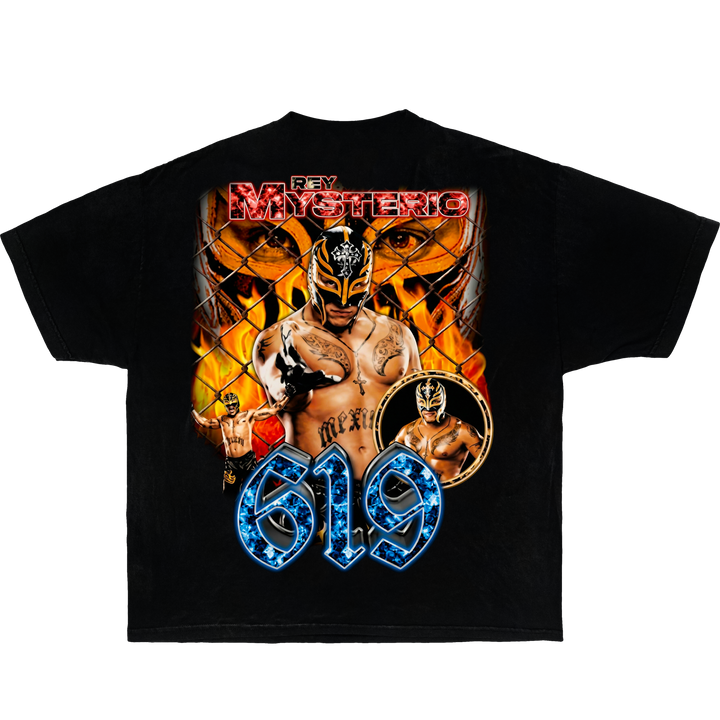 Black t-shirt with Rey Mysterio 619 Legend wrestling-themed designs.