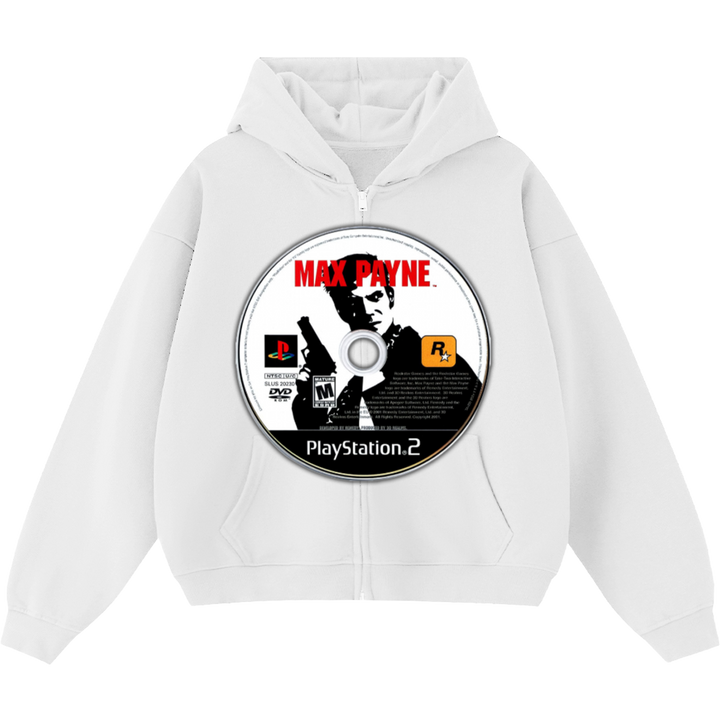 Max Payne Game Disc Cropped Zip-Up Boxy Hoodie | Streetwear Hoodies | Y2K Video Game Hooded Sweatshirt | Unisex Graphic Zip Ups | Oversized